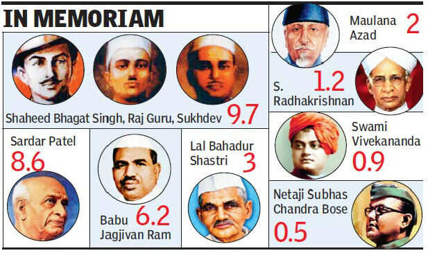 The government spent Rs 8.6 crore to observe the birth or death anniversaries of Sardar Patel, while the cost of keeping Babu Jagjivan Ram alive in public memory was Rs 6.2 crore. Former prime minister Lal Bahadur Shastri accounted for Rs 3 crore of government spending and the expenditure on the birth anniversaries of Maulana Azad and S Radhakrishnan was Rs 2 crore and Rs 1.2 crore respectively.